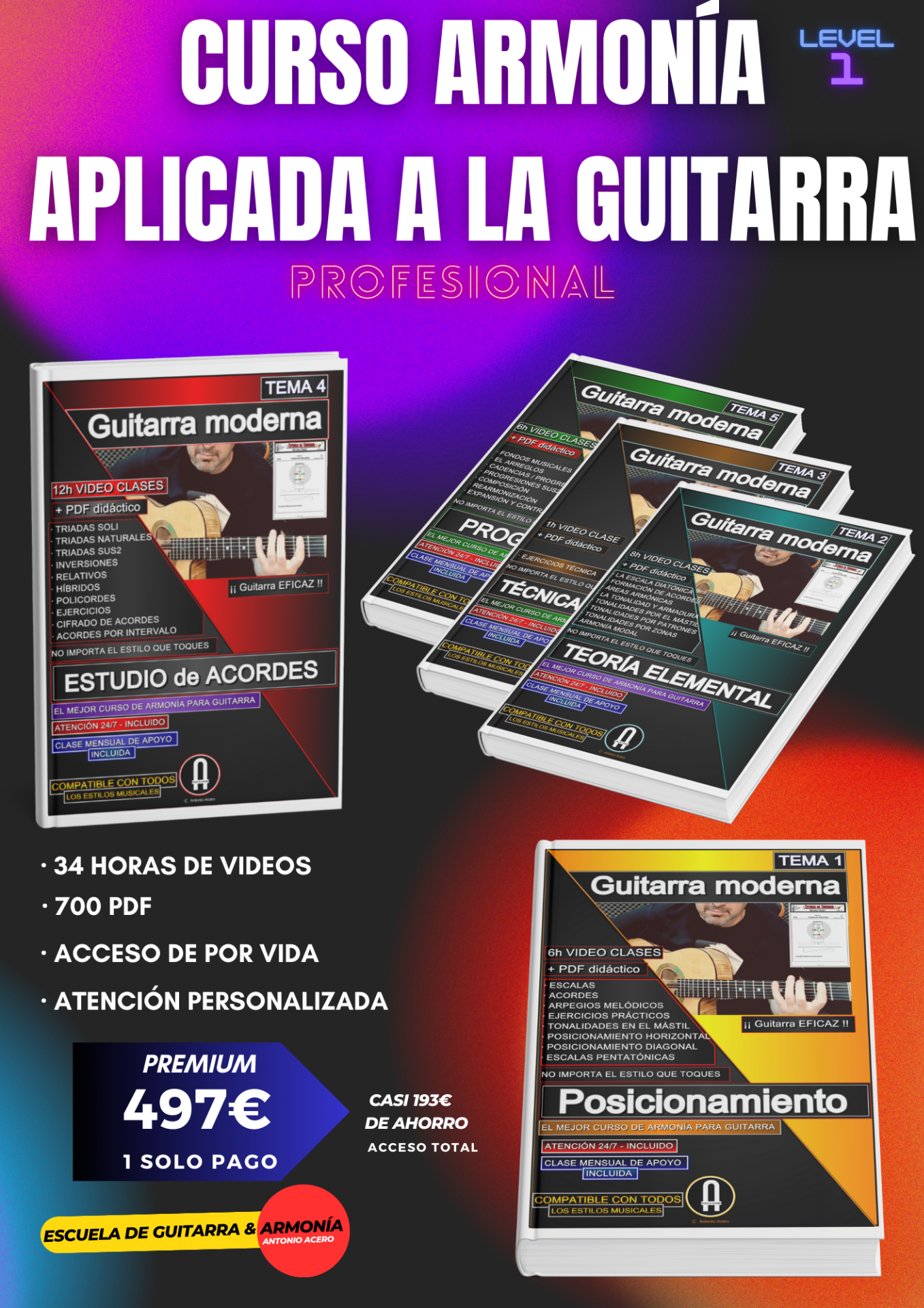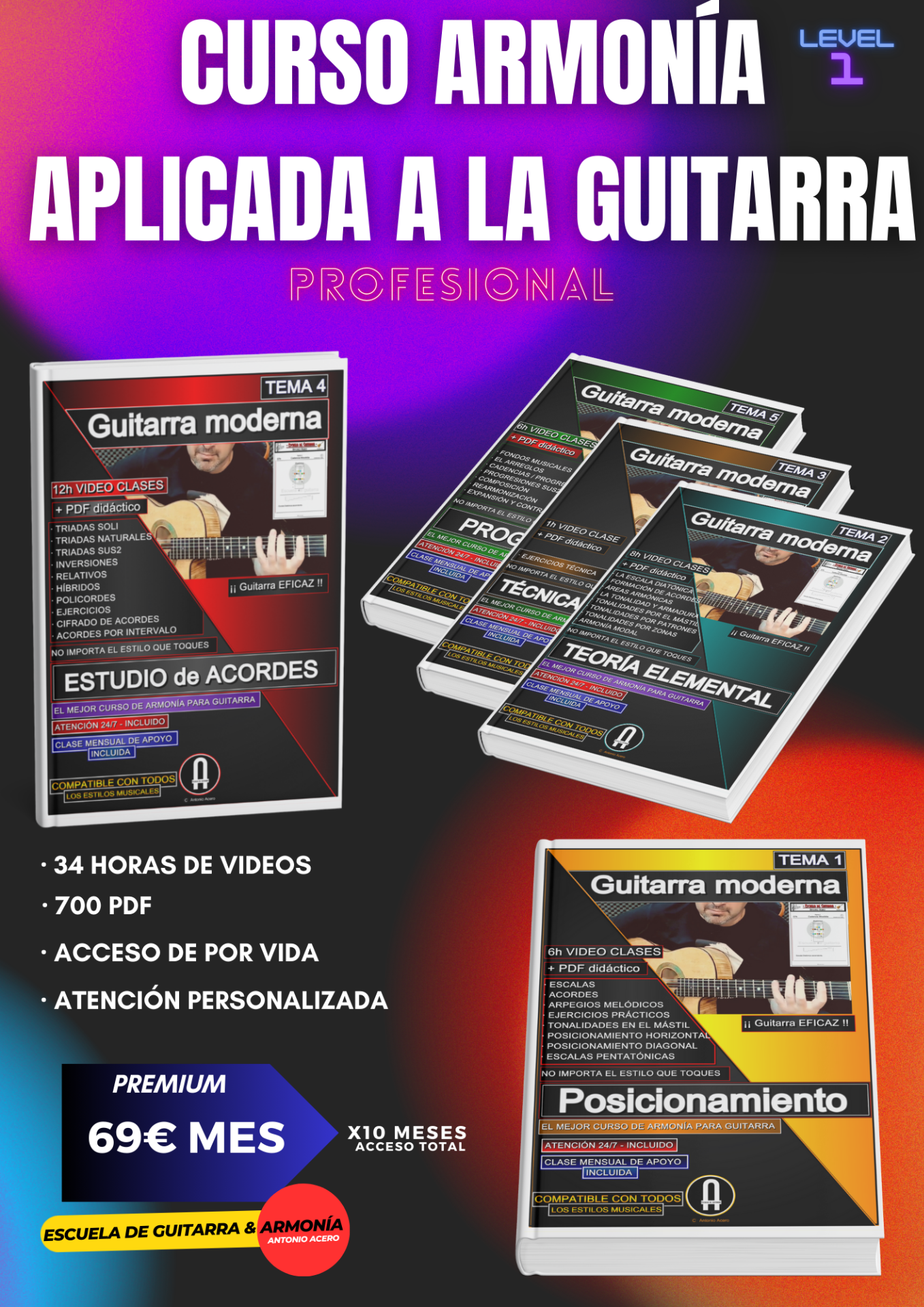 "Aprende con el método de Antonio Acero: 20 años de investigación y 12 libros publicados condensados en un sistema de Armonía Moderna que rompe con la enseñanza tradicional. De principiante a avanzado, paso a paso."